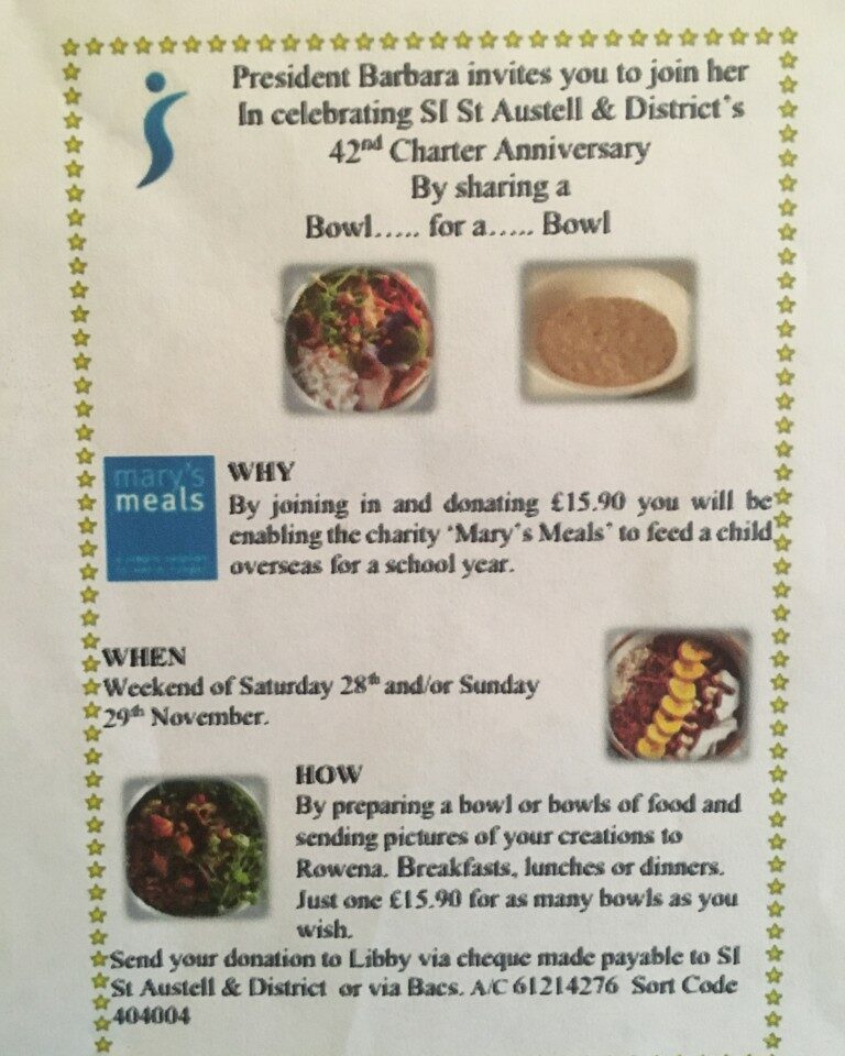 Back into the second lockdown and everything is online. Zoom Club, sub committees, Executive and Region meetings. Virtual coffee mornings and Book Club. 16 days of activism and any number of online webinars, and forums to join in with. The Sticker Memory Cafe celebrated its first year with monthly newsletters and treats for the guests and carers. Instead of our 42nd Charter Lunch members were invited to prepare and photograph a bowl of food and donate £15.90 for each bowl for Mary Meals. This will feed one child daily for a year.