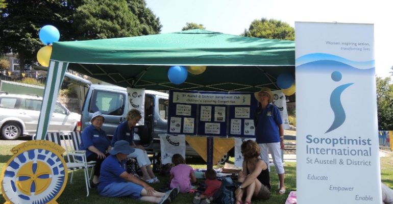 On the hottest day of the year we set up our Children’s Colouring Competition stall in Truro Road park alongside other local service organisations, The Truro Park Event was part of St Austell Feast Week. It was a quiet afternoon many families had sensibly gone to the beach but the children who did attend were happy to sit in the shade and draw. We also used the opportunity to promote our club and Soroptimist International.
