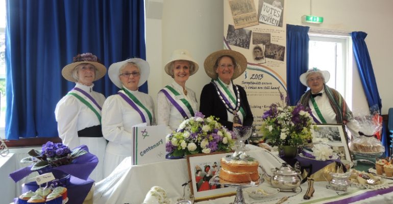 Our first prize winning stall at the League of Friends Hospital Fete. An Edwardian cream tea with members dressed as Suffragettes as we mark the centenary of their March from Lands End to London in 1913. Our banner states 1913 Suffragettes fought to give women a voice – 2013 Soroptimists ensure women’s voices are still heard.
