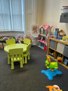 Carrie and Rae took us all over the buildings and through the different areas, from the kitchens, the computer suite, the quiet room, and even to the lovely creche (right). We admired the beautiful artwork on the wall, which like most of the art at the Trust, was done by the service-users themselves.