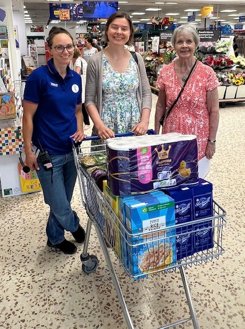 Sophie of WWA and Peggy Simson from Soroptimist International Thames Valley (SITV) met super helpful Nicky, a manager from Tesco. After Sophie and Peggy told her what WWAid offers to women seeking their support, Nicky explained how Tesco now administers its charitable donations. Nicky sat Sophie and Peggy down in the cafe while she went round the store picking up all the supplies on Peggy’s list. Although Peggy had only brought the list to illustrate what the needs are and what was normally bought, look at the photograph to see the result!