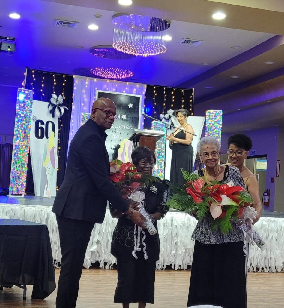 Two of the longest serving persons who were members when the club was chartered 60 years ago, Elsa Ferguson and Dorothy Callender (standing from left to right) each reach receive a bouquet of flowers from the club presented by Mayor of San Fernando, His Worship Junia Regrello.