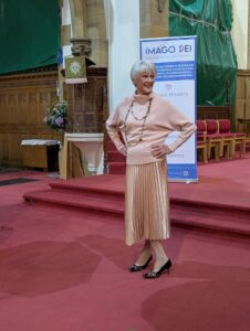 Carolyn and Jill helped the staff of Imago Dei set things up for the event, welcomed people on their arrival and provided them with their welcome drink.  Cherry appeared three times in the parade of models down the catwalk (the re-purposed church aisle), once in an “everyday wear” outfit, once in a set of winter clothes and once dressed for an evening occasion.  All the clothes modelled had been donated to the #SheMatters shop and after the show they were all available for sale.