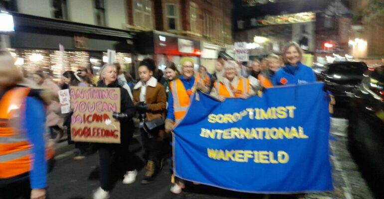 A delegation from Soroptimist International Wakefield and district braved the November cold to join the first Wakefield Reclaim the Night march in solidarity with other groups and individuals on Thursday 27th November. This marks day three of the UN Women 16 Days of Activism Against Gender-Based Violence campaign (25 November – 10 December) #NoExcuse. Club members wore orange and participated in banner making workshops and held an information stall prior to the march. Huge thanks to the organisers for enabling a fantastic event.