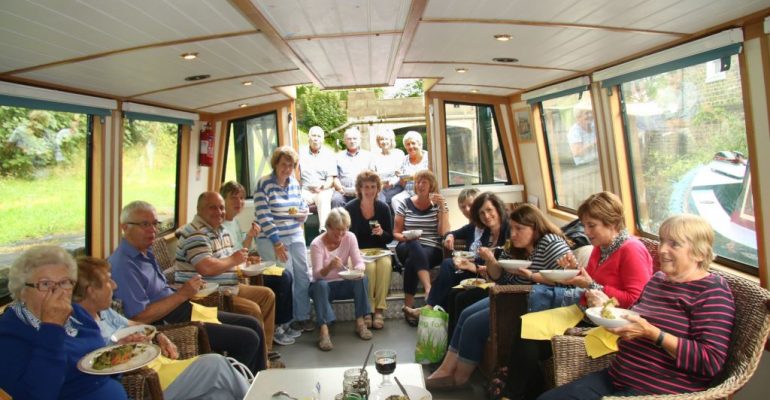 S I Wakefield took to the seas on 28 July – more precisely, members and friends cruised on the Calder & Hebble Navigation. Using two boats we set sail and travelled as far as Cooper Bridge, where we feasted on pie and peas followed by cakes, before returning to Mirfield. In spite of the rain earlier in the day, the sun shone and we were able to enjoy the peace and tranquillity of the canal. The cruise was booked through Safe Anchor Trust which is a charity based in Mirfield that organises trips for community groups. The Trust was originally set up by the Yorkshire Probation Service: skippers were probation officers and crews were offenders who operated the locks and acted as stewards. During this trip our members took turns to operate the locks and admire the passing scenery.