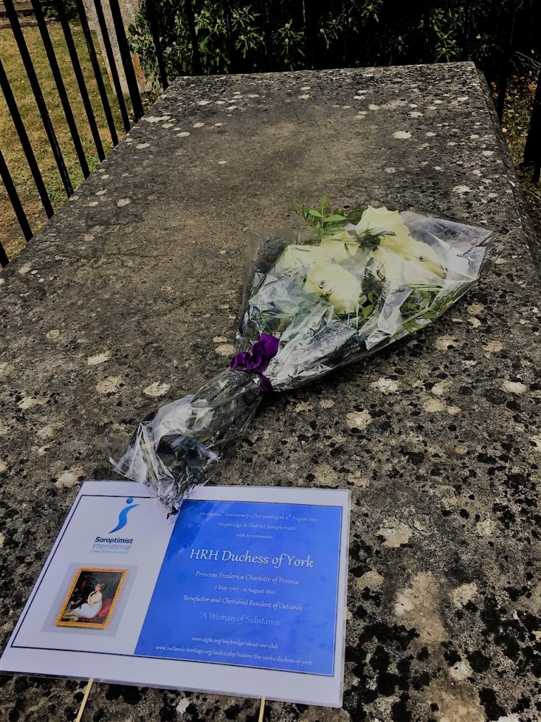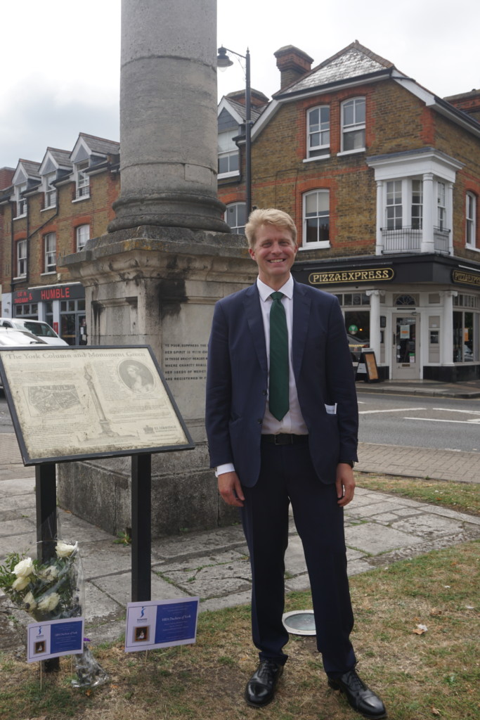 On August 6th 2020 the Weybridge Society remembered The Duchess of York – Frederica Charlotte Ulrica Catherine – a Prussian princess (1767-1820). She was a well loved royal and benefactor who died 200 years ago aged just 53 years. The York Column on Monument Green was erected by the citizens so saddened by her death in 1820, in recognition of the kindness and generosity she displayed to the town and its young people during her life at Oatlands House. Dr Ben Spencer MP, local dignitaries, historians and members of the Society met to remember her works and toast her life beside the column.