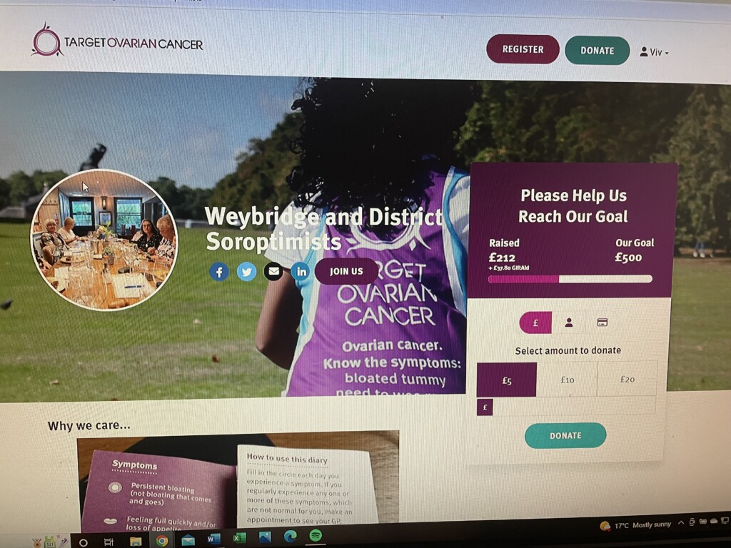 Today we #Soroptimists tested our stamina and the planned route for Weybridge & District #Soroptimists’ part of the annual Target Ovarian Cancer charity Walk/Run; it was rather nicer walking into the sunshine from Hampton Court Palace stopping at the cafe after the 10km in Bushy Park. It took 2hrs 20m with a few photo stops of the sights along water; by the end of the team walk on Saturday 8th Caroline, Brenda, Viv, Brenda’s daughter, Pippa and Ann will have walked 65km over a week in support of #targetovariancancer. Amazing weather today, fingers crossed for the same on Saturday when we #Soroptimists set off at 10am. To date we’ve raised over £400 with gift aid contributions! Thank you everyone for the amazing support. Like to top it up…?.. share it with friends?.. you can donate just a small sum or pledge more and tick the box for gift aid if you pay tax.