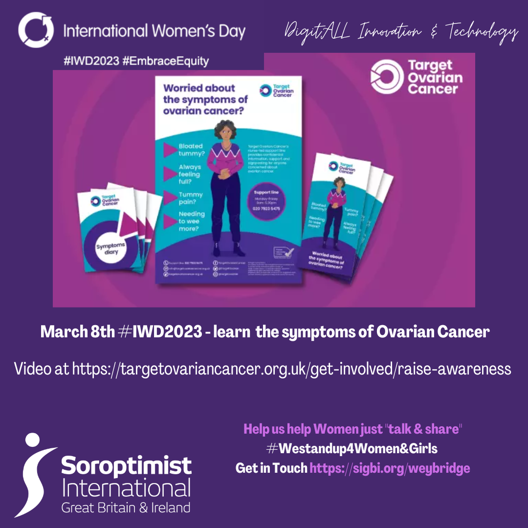 During March SI Weybridge & District is sharing information from one of the leading Ovarian Cancer charities, please share our posts to other women. On International Women’s Day this years theme of #embracingequity in the use of #digitalinnovation and technology is close to our aim of improving women’s well being and health. On #IWD2023 check yourself for the symptoms, discuss the symptoms and information sources with other women over a coffee, let’s talk and share, maybe it will help save a life or enable early detection of other disease.