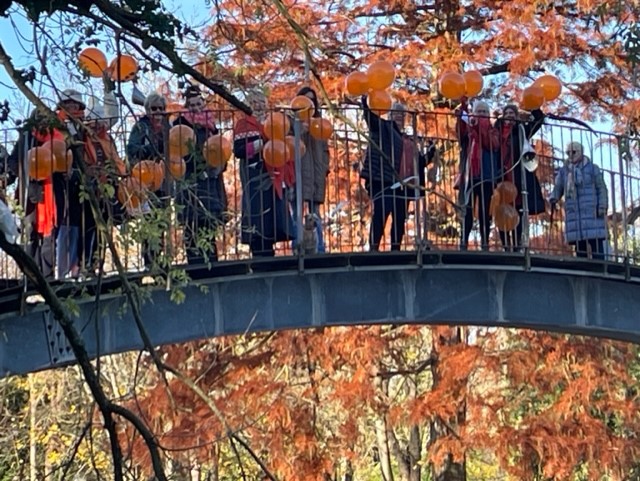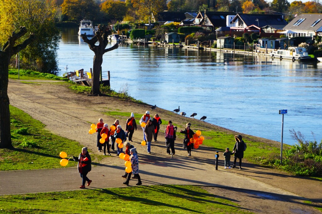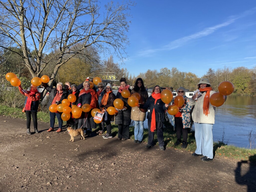 Following on from the success of our monthly #OrangeCafes, this year we upped the scale of our activities to mark the start of #16days of activism. Saturday November 25th was a cold but bright winter’s morning. A group of club members met up for a ‘Walk & Talk’ Café Crawl along the Thames towpath between Walton & Weybridge. Our aim was to raise awareness of #16Days and the UN Day for the elimination of violence against Women. We were joined by Soroptimist sisters from the region as well as family members & the Outreach team from #Northsurreydomesticabuse. We met at the Cowey Sale café then we all walked & talked all the way to D’Oyly’s Café. The island setting offered a great photo opportunity on the bridge across the river. Even the tree in the background was orange! We were all wearing orange & armed with handouts & orange balloons to walk the towpath. The Orange procession attracted attention & we stopped to spread the word. ‘Keep up the great work’ was heard many times.