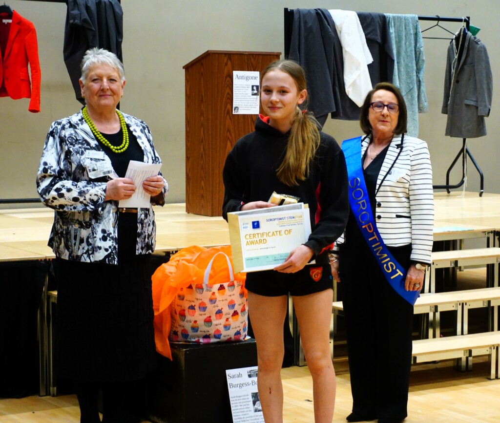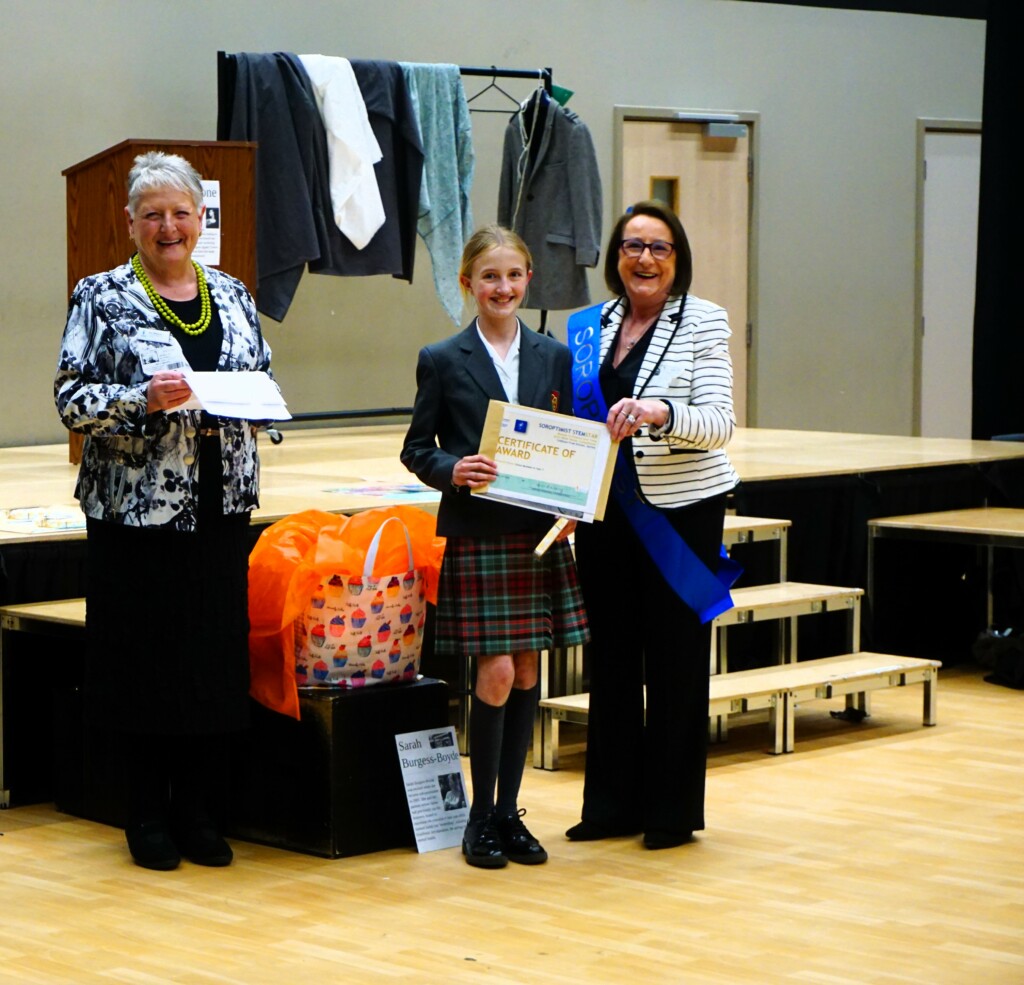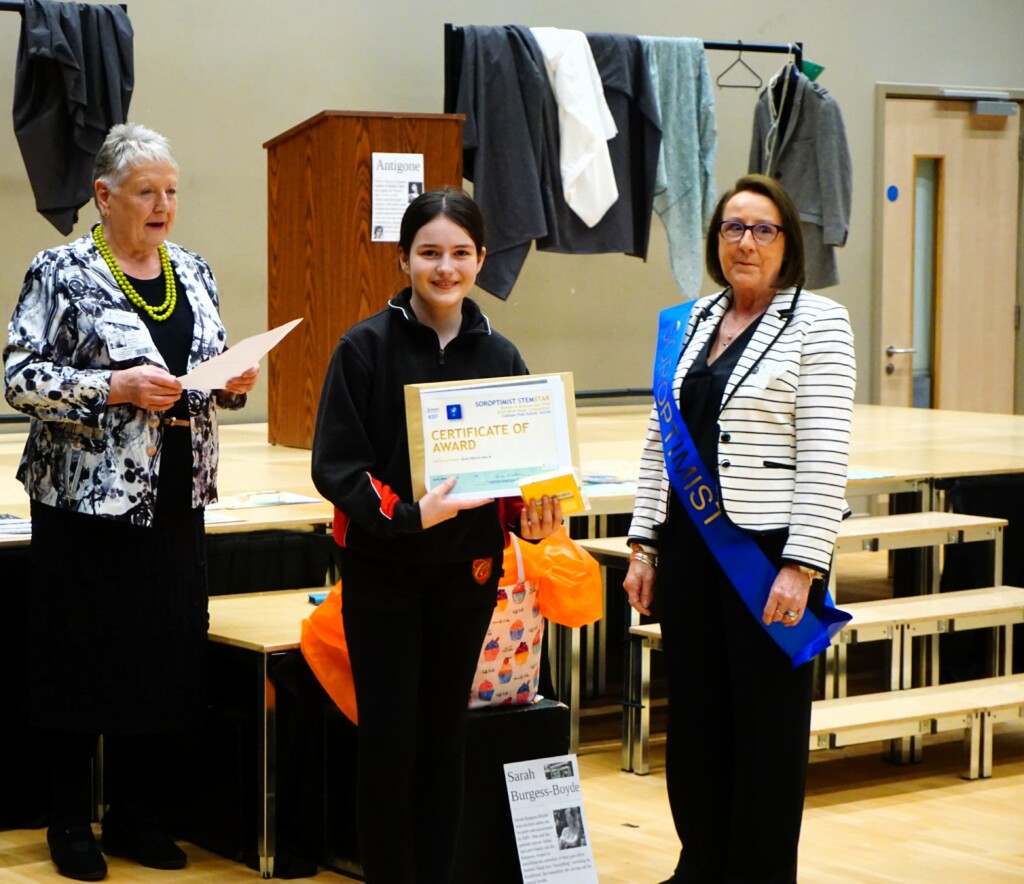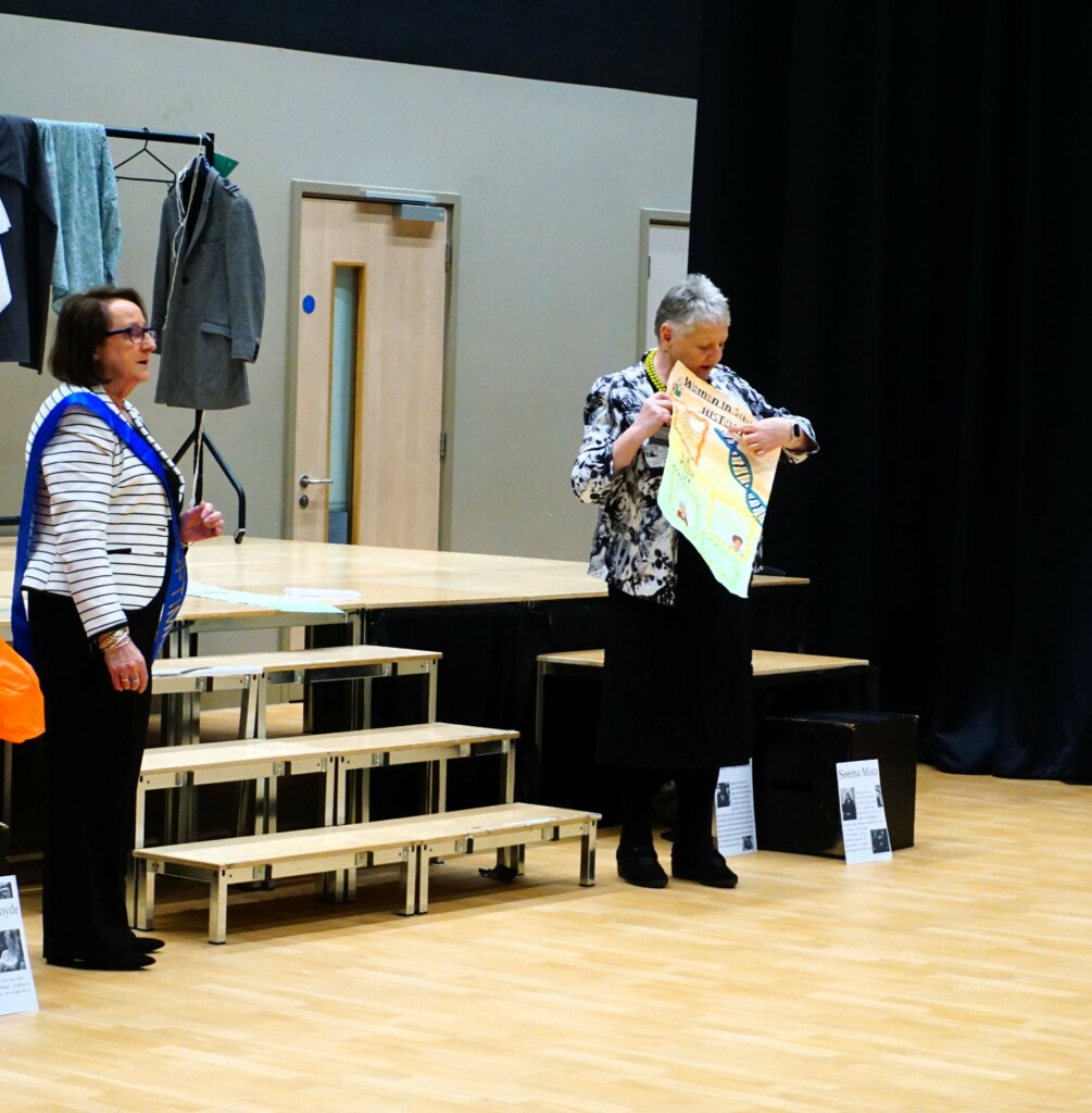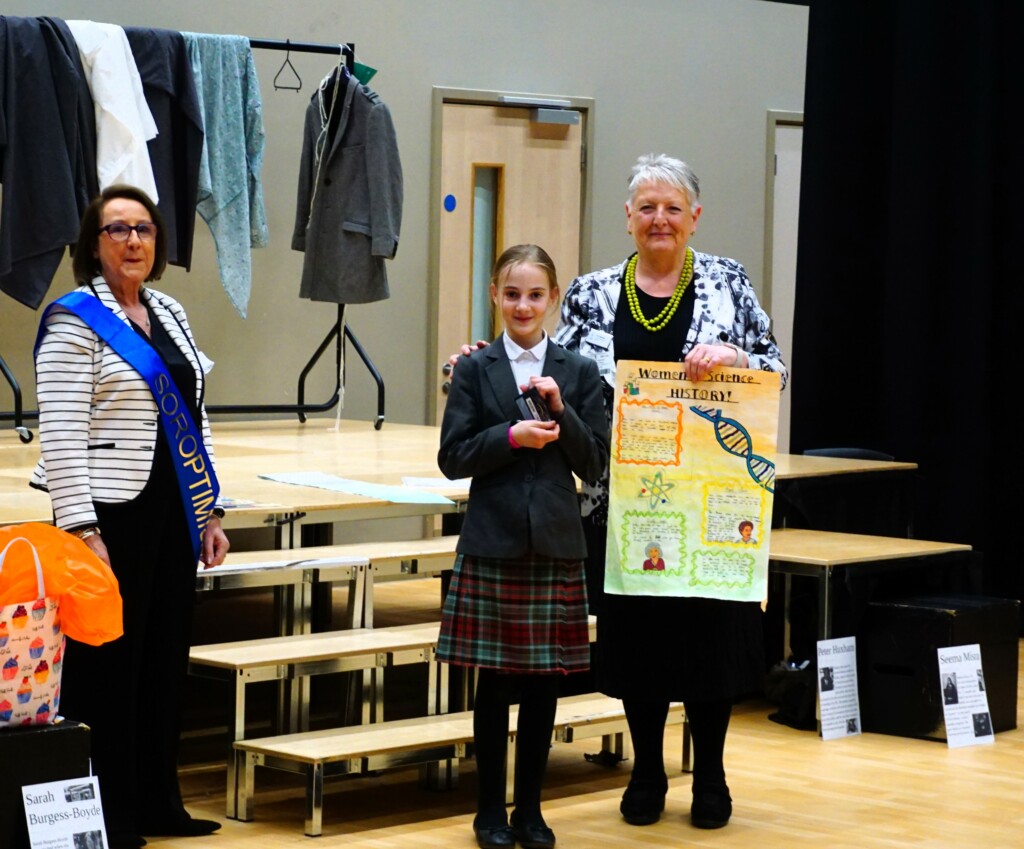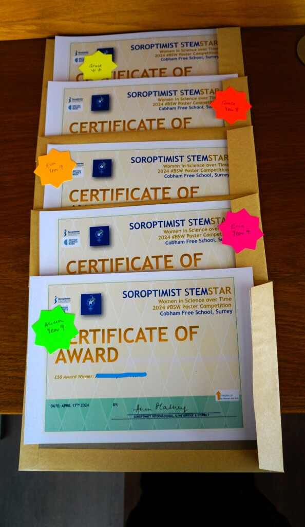 SI Weybridge & District soroptimists hosted a Year Group assembly on April 17th at Cobham Free School. This followed a successful launch of the British Science Week Poster Competition with the science teaching team during a February assembly. The SI #STEM team presented Soroptimist #STEMSTAR certificates and Amazon vouchers to 5 winning poster artists and 3 excellent runners up. The winners in Years 7,8 and 9 created posters presenting research information on “the impact of women over time on science and technology”. With so many excellent posters submitted by boys and girls (all created in a short time), judging was fierce and intense.