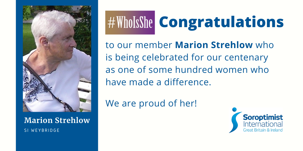 This month our Club is thrilled to see our nomination for the Centenary WhoIsShe? recognition has been made to Marion Strehlow, a club member since 1975. SI Weybridge Member MARION features as one of 100 Soroptimists commemorated in our Centennial Year – MANY CONGRATULATIONS