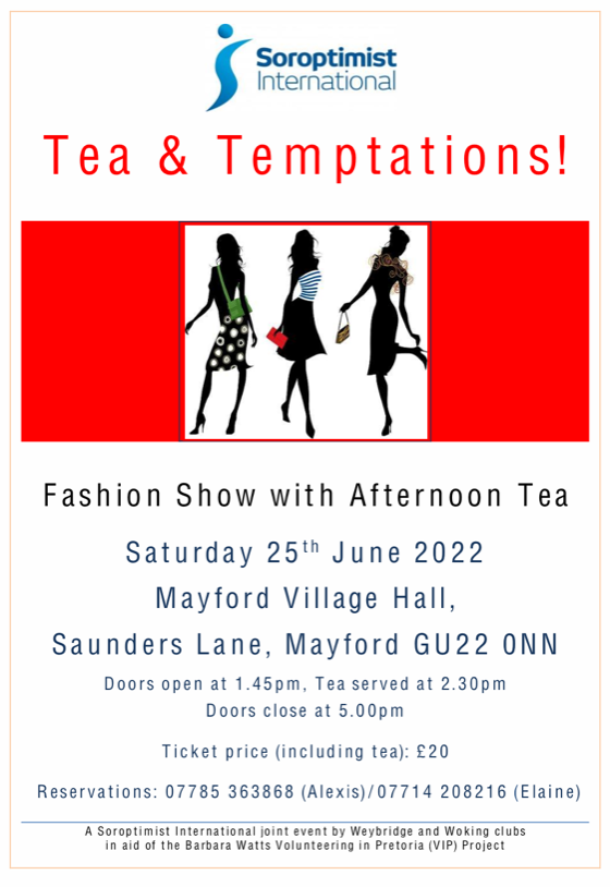 Sat 25 June – Tea and Temptations Fashion Show – Joint SI Woking – Fundraiser for Barbara Watts VIP Project Pretoria at Mayford Village Hall, Woking from 2.00-5.00pm – 50 Tickets available £20
