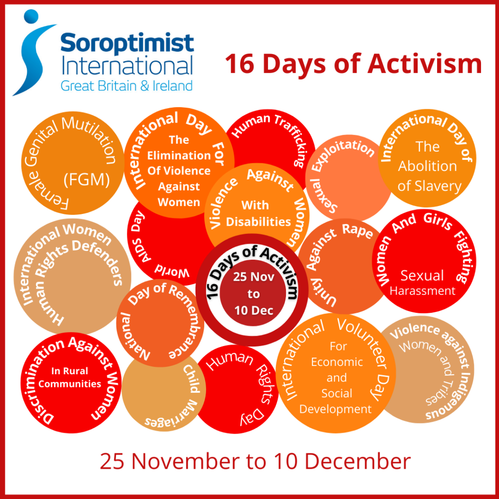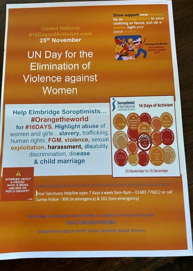 Join them if you can, wear orange during the #16daysofactivism until December 10th, tie orange ribbons to fences and railings, put up a poster, light your porch orange. From small steps we can achieve big strides for women and educate everyone about the terrible and increasingly prevalent issues faced by those adults and children in abusive relationships. In this period Soroptimists are collecting donations for #NorthSurreyDomesticAbuse Services #NSDAS.org. For giving details get in touch. https://www.facebook.com/SoroptimistsElmbridge or https://sigbi.org/weybridge/