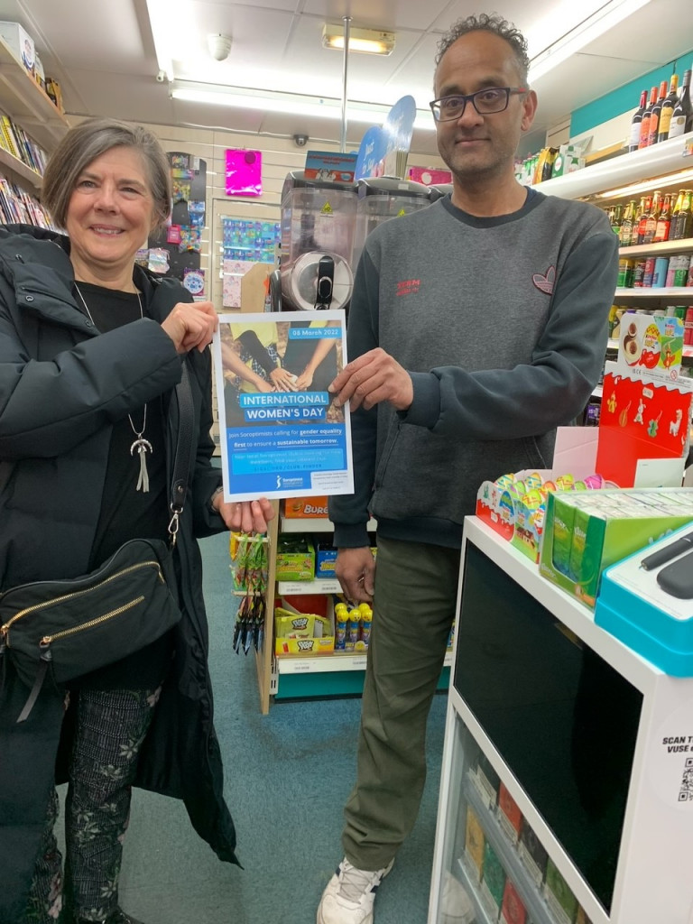 March 8th – #IWD2022 – SIGBI posters are up and visible we were so delighted with the positive response of shop keepers, stations, libraries and supermarkets to helping #Soroptimists make the community more aware. One Czech woman we spoke to in #Mercado in Molesey explain that in her country flowers are distributed to all women on IWD, its a far more important date then Mother’s Day as it recognises that ALL women need support to obtain equality and alleviate poverty. SI clubs around the world are challenging bias and highlighting how we can make the world a fairer place.