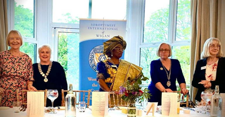 SI Wigan held their 81st Charter Dinner at Ashfield House , Standish , Wigan on Friday 6th May. President Angela Holmes is pictured here with Kathleen Moran the SI Wigan PAC Chair welcoming their guests to the Dinner. Mrs Dorcas Akeju OBE, The Regional President of Soroptimist International of South Lancashire , spoke at the Dinner in response to Mrs Kathleen Moran’s address to the club. After a splendid meal guests were able to listen to and dance to a special performance provided by Acoustic Jukebox. Many guests remarked as they left that it had been a ‘ very enjoyable evening and thanks should be awarded to the organisers’.