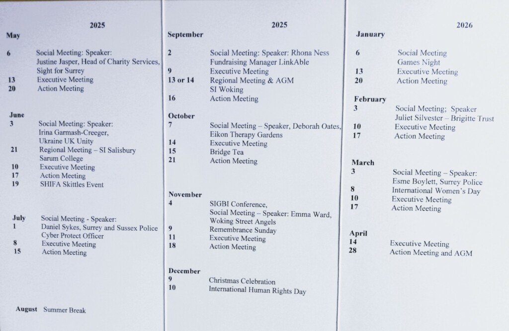 SI Woking and District meets on the first and third Tuesday of the month . Some meetings are social events – we have dinner together and invite a speaker (first Tuesday). The other meetings are working meetings during which we discuss our projects and planned activities (third Tuesday). We also organise awareness and fundraising events.